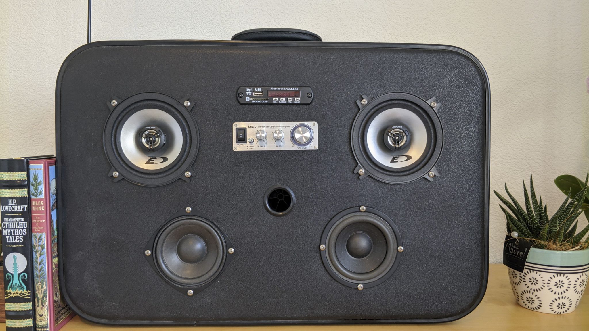 Cette enceinte/boombox dans une valise de type suitcase aux lignes arrondies en vinyle noir et poignée noire,